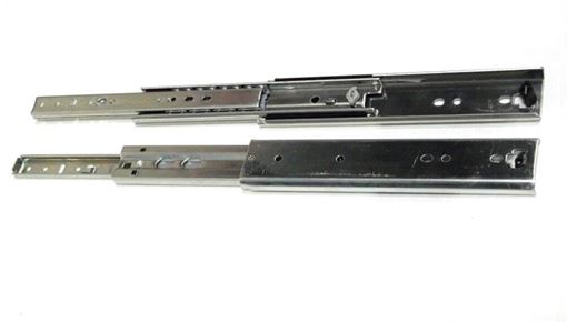 Pair of telescoping precision full extension drawer slides. Designed for high loads with a 250 lb. capacity. Zinc plated to prevent rust. Screws not included. See attached pdf file for full specs.