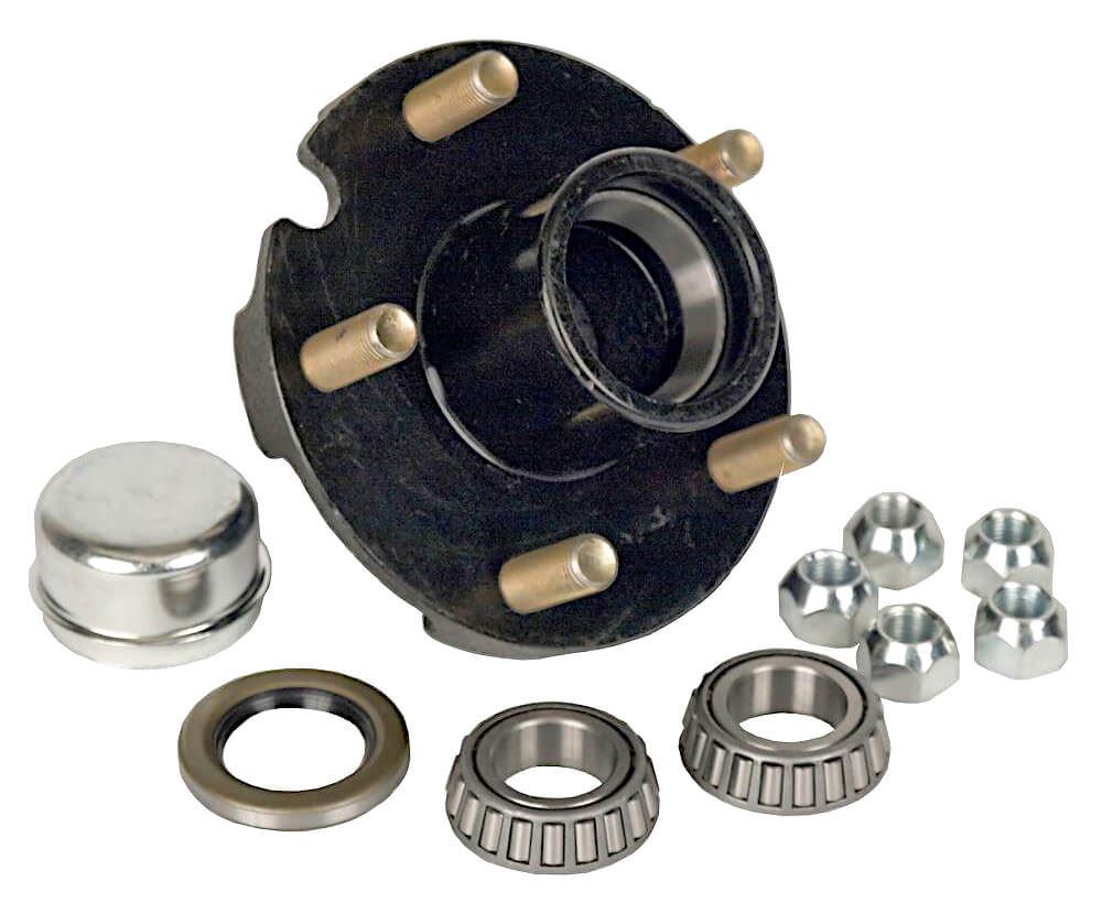 Complete 5 Hole Trailer Hub Kit. Fits 1-1/4" axle spindle, 1250 lbs. capacity, demountable. This high speed trailer hub is ideal for highway rated trailers. The trailer hub assembly includes: nuts, bolts, 2 bearings, 2 bearing cups, 1 grease seal and a dust cap. Specs: bolt size: 5 stud, inner bearing size: 1-1/4" part LM67048, outer bearing size: 1-1/4" part LM67048, hub length: 4-3/16", distance between races: 2-3/16", hub capacity: 1250 lbs.